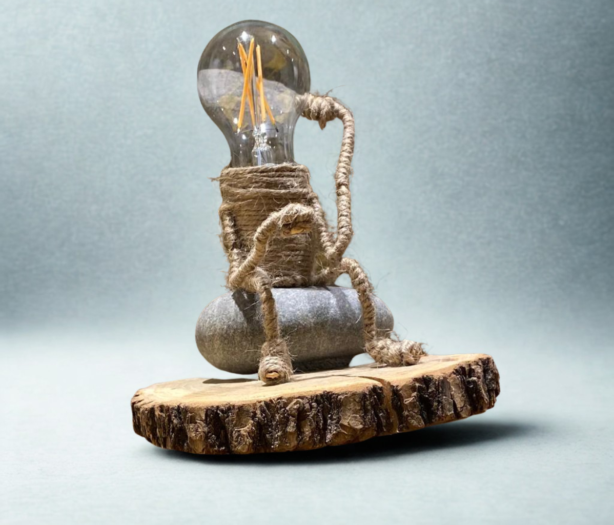 Die Tischlampe „Der Denker“ ist ein außergewöhnliches Designobjekt, das mit seiner einzigartigen Form und den nachhaltigen Materialien für Aufmerksamkeit sorgt. Die handgefertigte Lampe kombiniert recyceltes Holz, Flussstein und Juteseil zu einem faszinierenden Kunstwerk, das sowohl künstlerischen Ausdruck als auch funktionale Beleuchtung bietet. Die denkende Figur als Design-Element macht sie zu einem wahren Blickfang in jedem Raum.