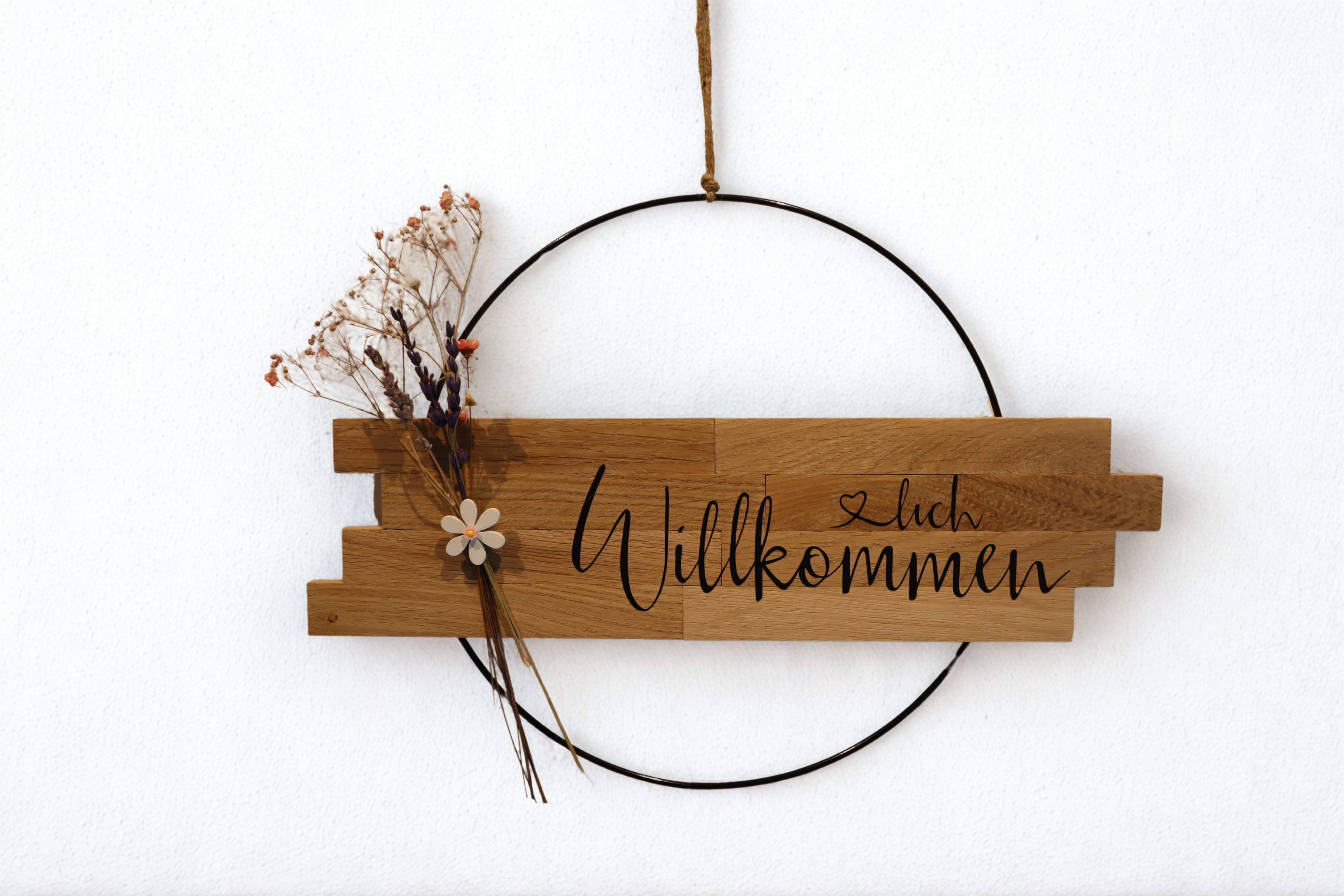 Der "Herzlich Willkommen" Schriftzug wird von Hand aufgetragen und mit ausgewählten Trockenblumen geschmückt, die dem Schild eine warme, natürliche Note verleihen. Die dezente Metallring-Aufhängung sowie eine integrierte Juteschnur machen das Anbringen an der Tür oder Wand besonders einfach.
