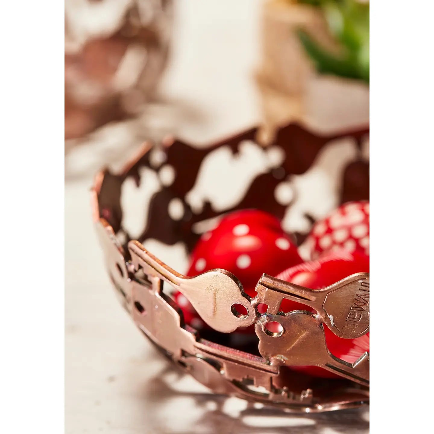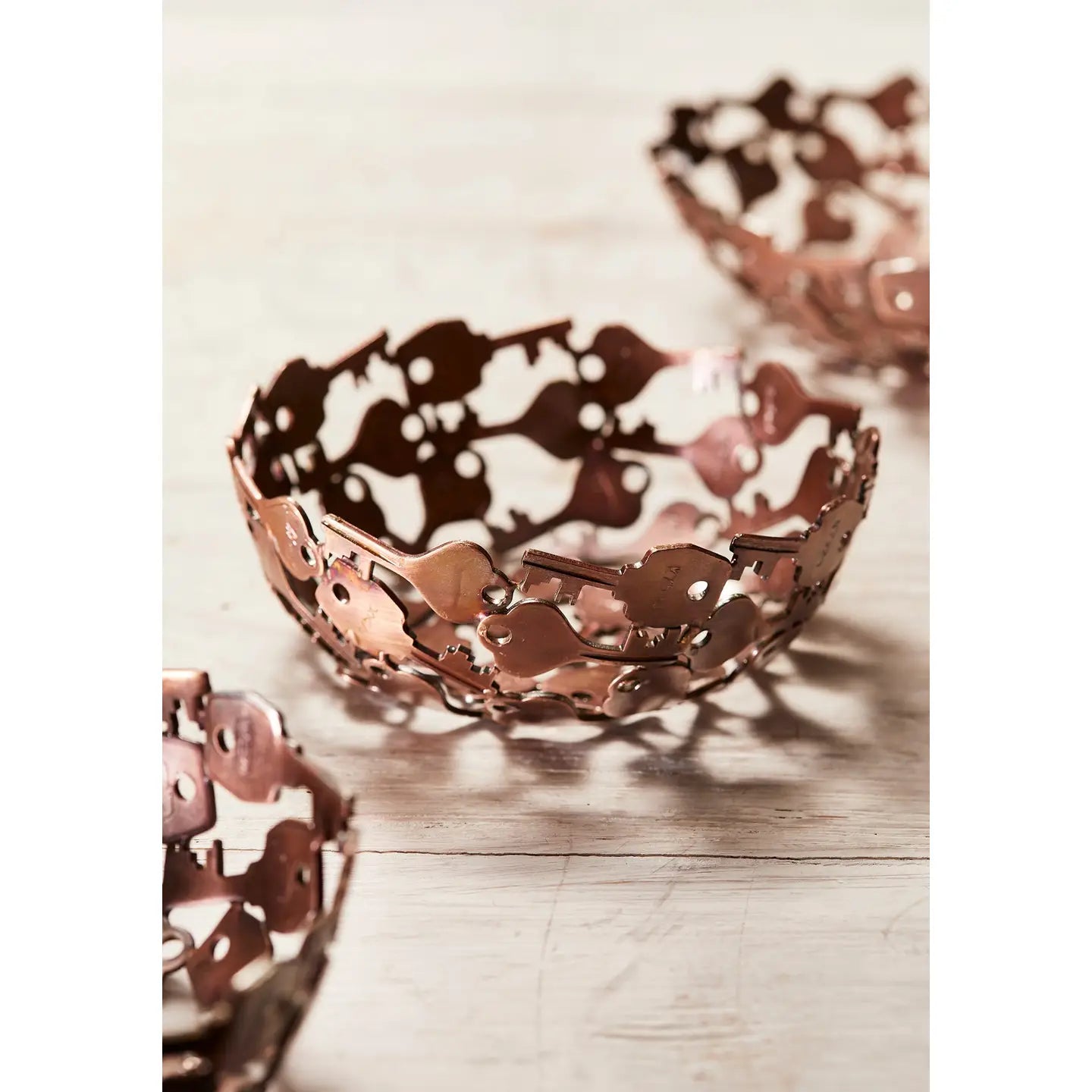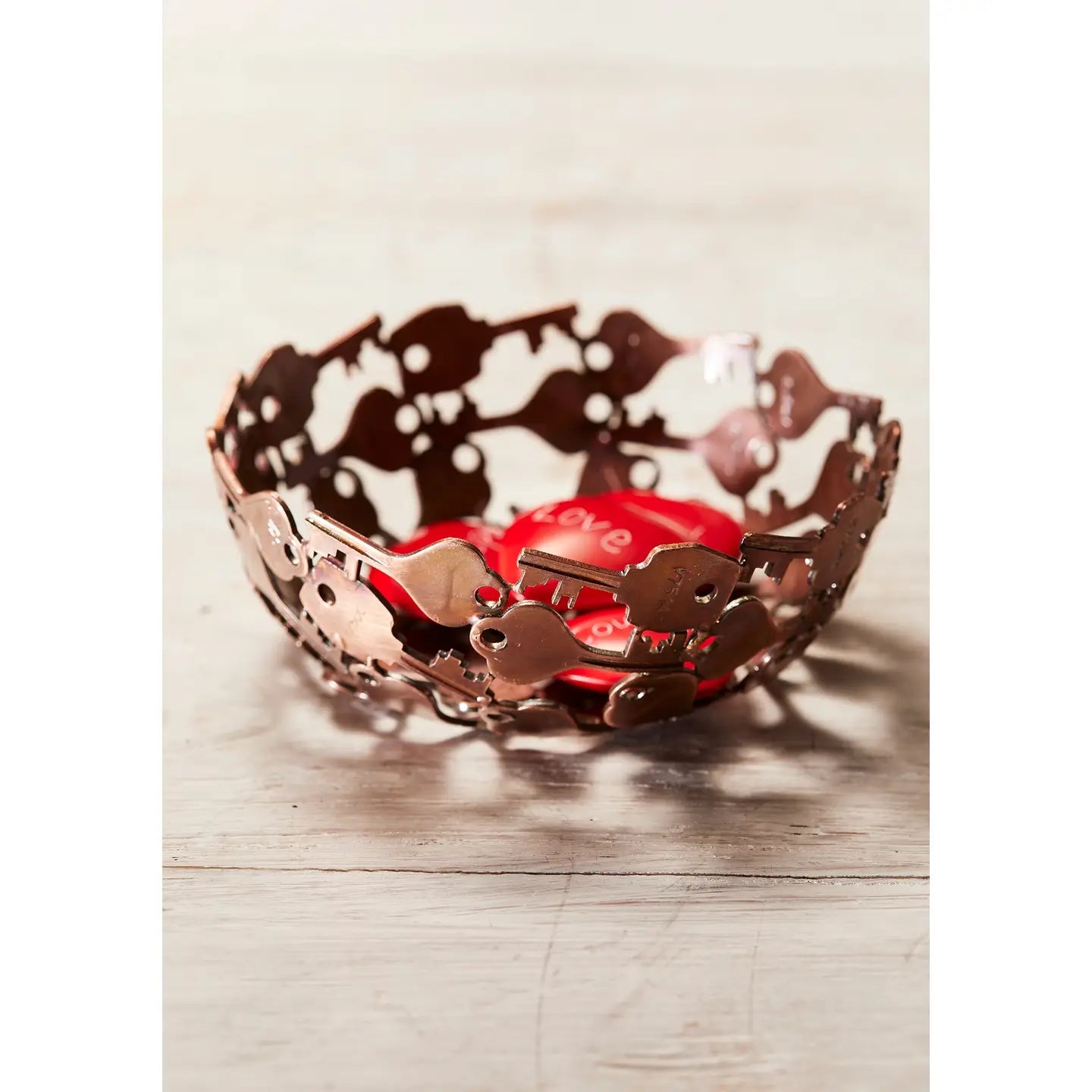 Diese außergewöhnliche Schlüsselschale wird aus wiederverwendeten Eisenschlüsseln gefertigt und vereint Nachhaltigkeit mit kunstvoller Handwerkskunst. Die antike Kupferoberfläche verleiht ihr einen rustikalen Charme und macht sie zu einem stilvollen Hingucker in jedem Zuhause. Perfekt als Schmuck- oder Ablageschale für Schlüssel, Münzen oder kleine Alltagsgegenstände.