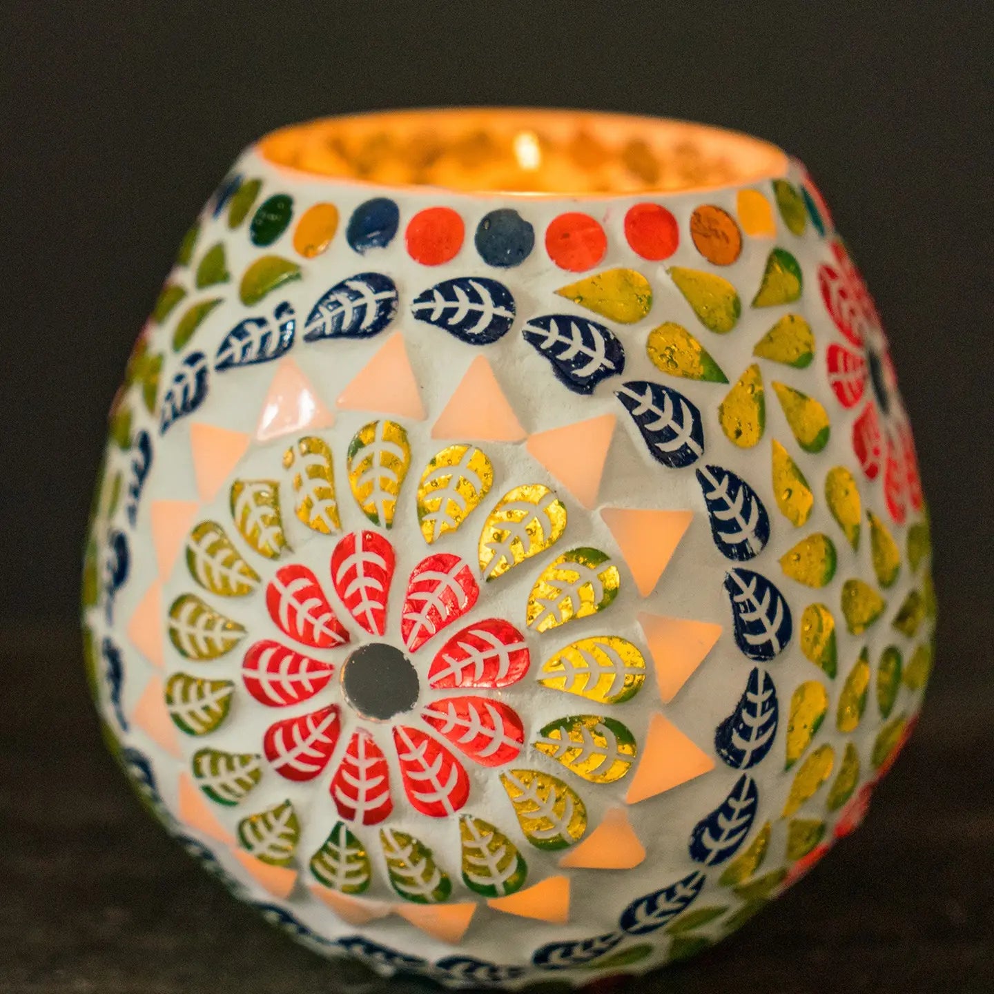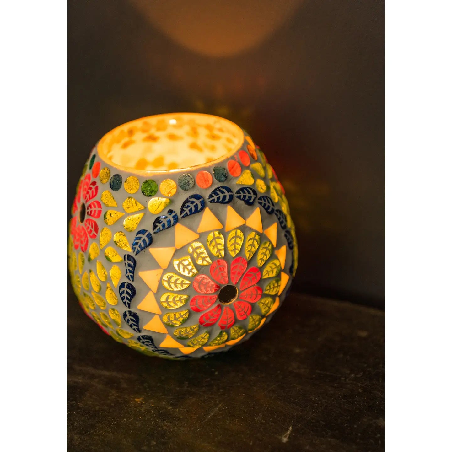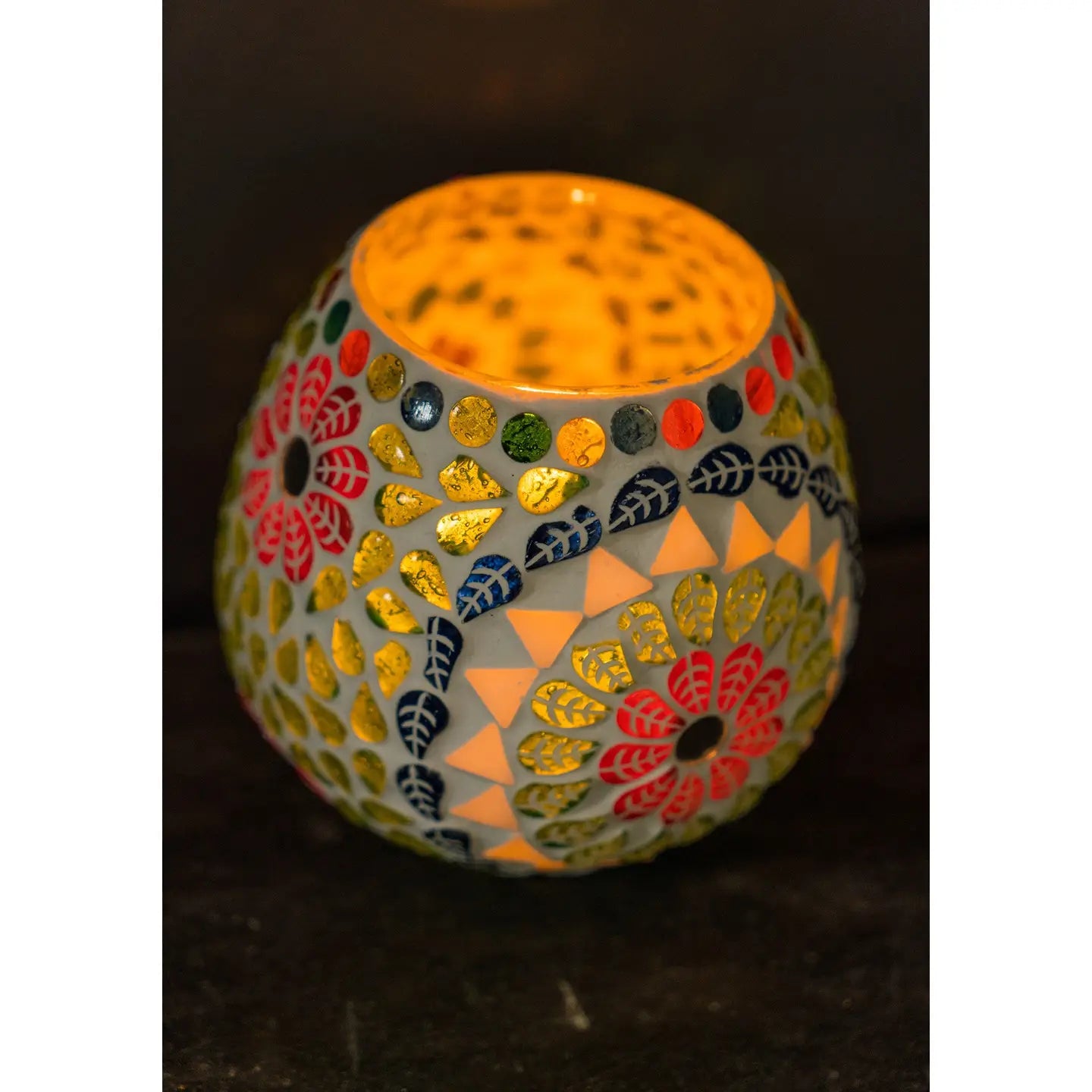 Dieser handgefertigte Teelichthalter aus recyceltem Glas vereint Nachhaltigkeit mit kunstvoller Ästhetik. Eine faszinierende Mischung aus schimmernden Perlglanz- und kräftigen Blockfarben formt ein lebendiges florales Mandala-Design. Sobald das Teelicht entzündet wird, entfaltet sich ein zauberhaftes Farbspiel und schafft eine warme, einladende Atmosphäre.